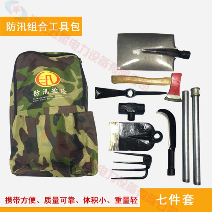 防汛組合工具包七件套:鎬、鈀、鋤頭、十磅錘、砍刀、方鏟、消防斧頭、活動柄、工具包。一柄多用,適用于救援隊員使用