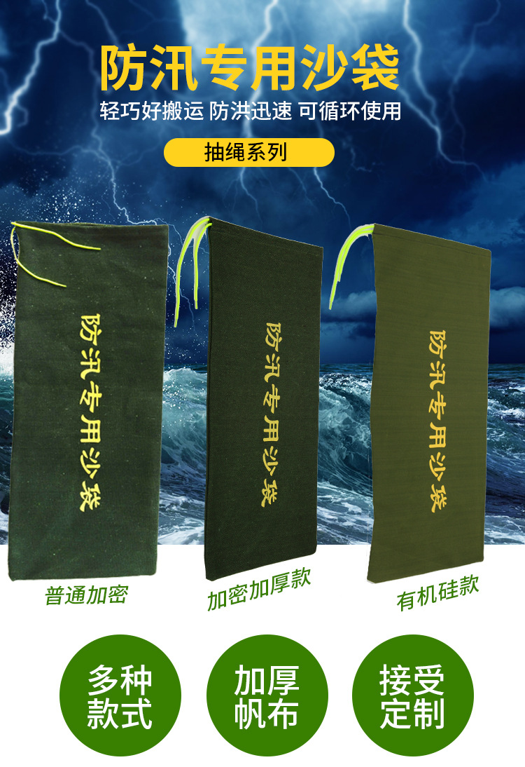 防汛沙袋一般分為兩種,一種是普通防汛沙袋,另一種是吸水膨脹防汛沙袋。
